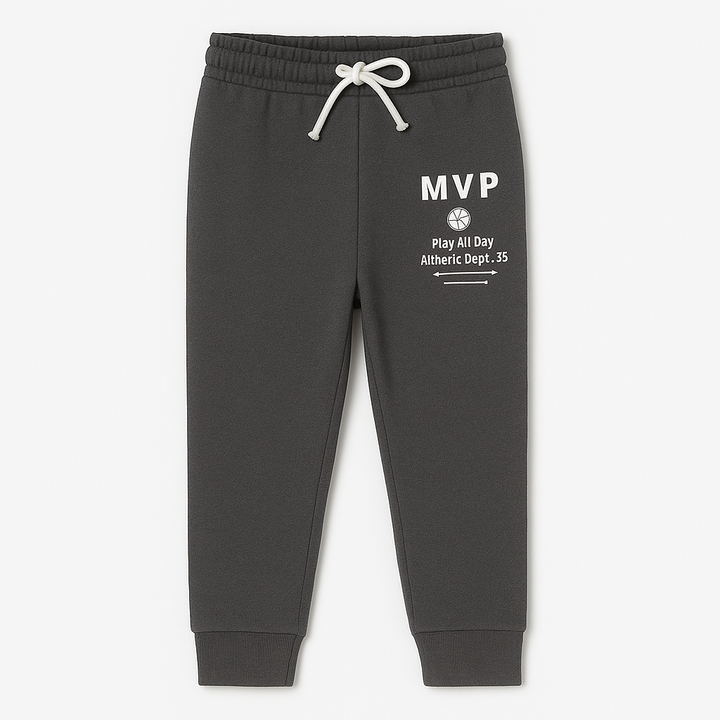 Keep your little one comfortable and stylish all day with our Terry Boys Jogger Pant. Made from soft, breathable terry cotton, these joggers feature a flexible elastic waistband with an adjustable draw cord for the perfect fit. The ribbed cuffs give a snug finish, while the sporty “MVP” graphic print adds a cool, athletic touch. Perfect for playtime, school, or casual outings, these joggers combine everyday comfort with an active look.