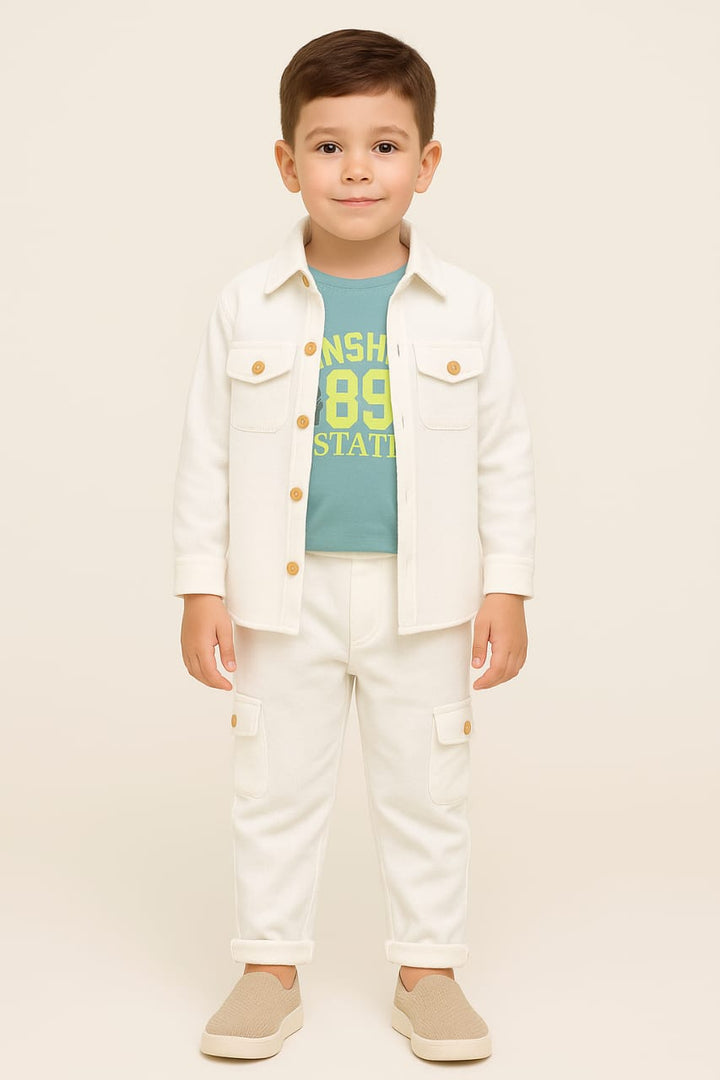 Cord Set with “Seaside” Tee – a classic yet playful outfit designed for all-day comfort and effortless style. The set includes a textured navy overshirt with wooden buttons and flap pockets, layered over a crisp white cotton T-shirt featuring a charming “SEASIDE” lighthouse print. Paired with matching navy cargo trousers with adjustable cuffs and utility pockets, this look brings a modern coastal vibe to kids’ everyday wear — ideal for playdates, outings, or casual adventures.