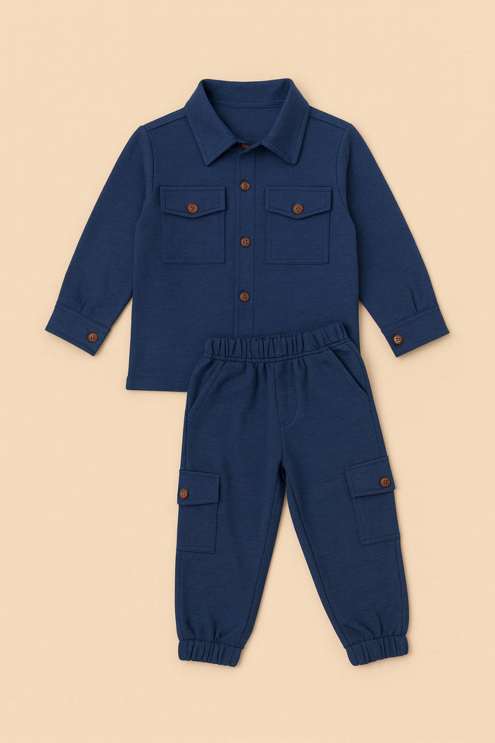 Introduce your little explorer to comfort and style with this Navy Safari Suit. Crafted from soft French terry fabric, it offers a cozy feel perfect for active play and everyday wear. The charming wooden buttons add a natural, thoughtful touch that sets this piece apart. Designed for boys who love adventure, this suit combines practicality with a timeless safari aesthetic that works beautifully for casual outings or special occasions.